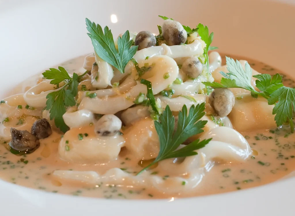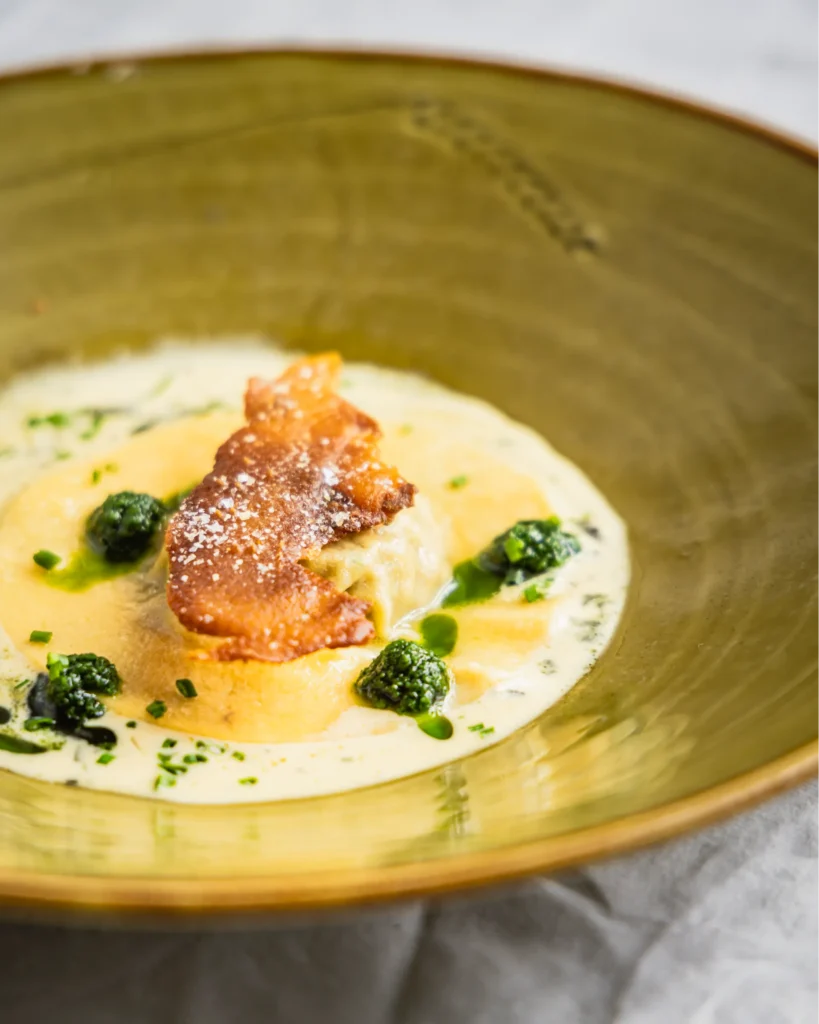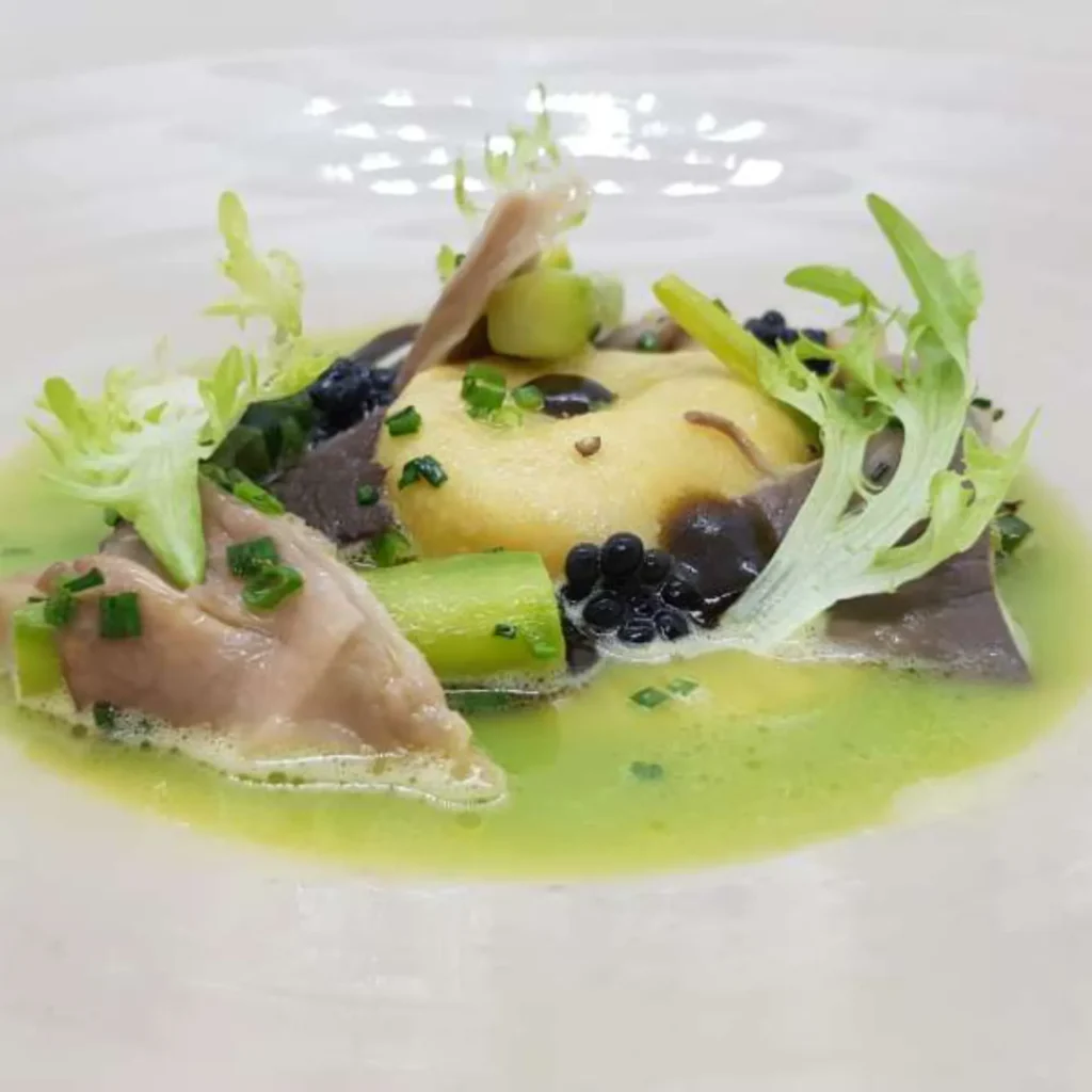 Mutton Bird Raviolo | Champagne Cream | Gremolata