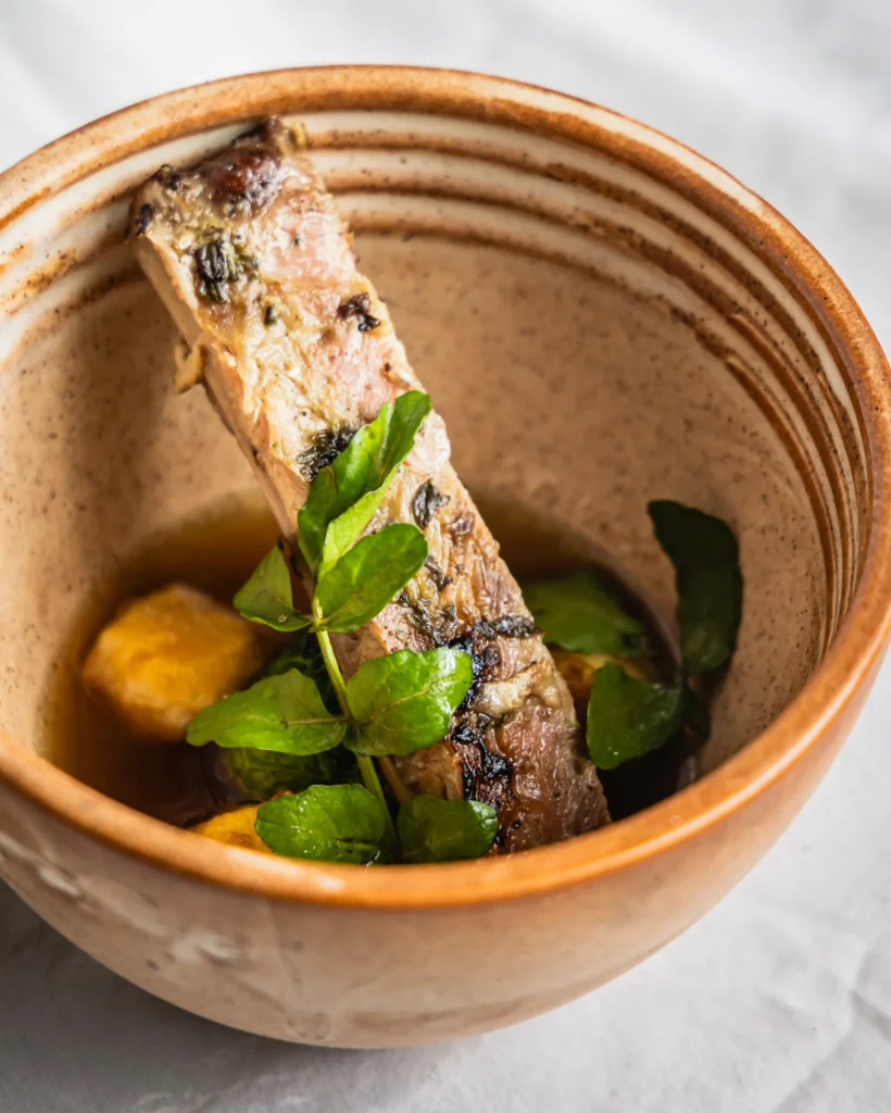 Razor Back Rib | Smoked Eel Dumpling | Bacon Broth